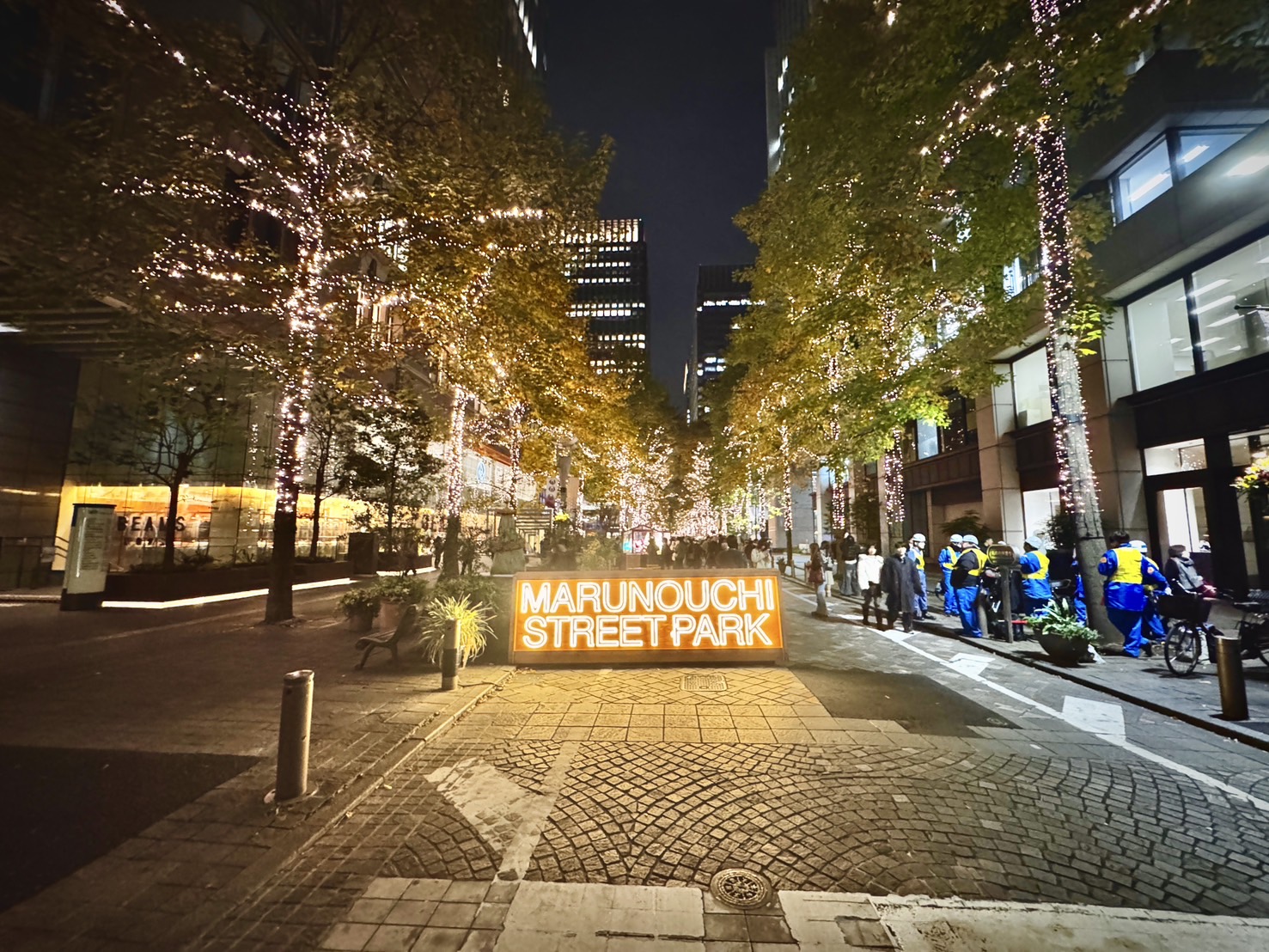 夜、丸ビルから仲通りへ向かってゆっくり歩いていくと、まずは駅前の明るさから少しずつ“光の並木道”へ入り込む感覚がありました。街路樹のイルミネーションが始まるポイントあたりで、ふと立ち止まり、上を見上げると、無数の“ゴールドの光点”が枝々に宿っていて、まるで夜空の星が地上に降りてきたかのような錯覚さえ覚えました。